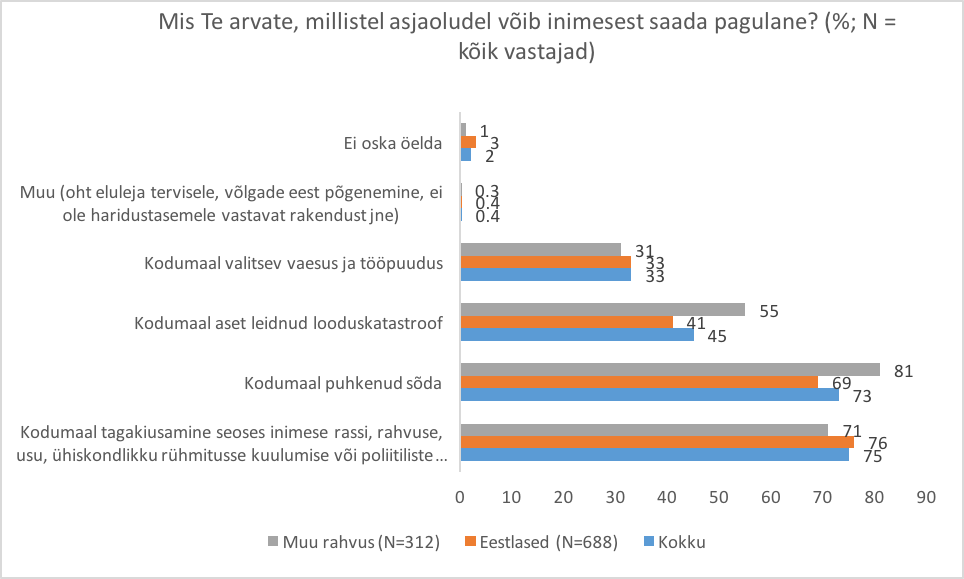 Lõpetuseks – elanikkonna pagulasi ja rahvusvahelist kaitset puudutavate hoiakute tõlgendamiseks ja nende hoiakute kujundamiseks on oluline, et kõigepealt uuritaks küsitletavate teadlikkust põhimõistetest. Kui küsitletavad ei tea, kes on pagulased (nt võrreldes rahvusvahelise kaitse taotlejate või majandusimmigrantidega) ja on pagulaste Eestisse toomise vastu, siis võiks olla rahvusvahelist kaitset pakkuda sooviva valitsuse esimene ülesanne teha rahvale mõisted selgeks. See ei peaks olema kuigi raske. Kui aga elanikkond on pagulaste vastuvõtmise vastu, hoolimata sellest, et üldiselt teatakse, kes on pagulased ja miks nad oma kodus ei saa edasi elada, seisab sama valitsuse ees hoopis keerulisem veenmistöö. Kuna paari viimase aasta uuringud (TNS Emor 2015, Kantar Emor 2016) ei mõõda elanikkonna teadlikkust põhimõistetest, ei saa me nende põhjal paraku kindlalt öelda, kas eestimaalased on umbusklikud pagulaste või hoopis müütide vastu.