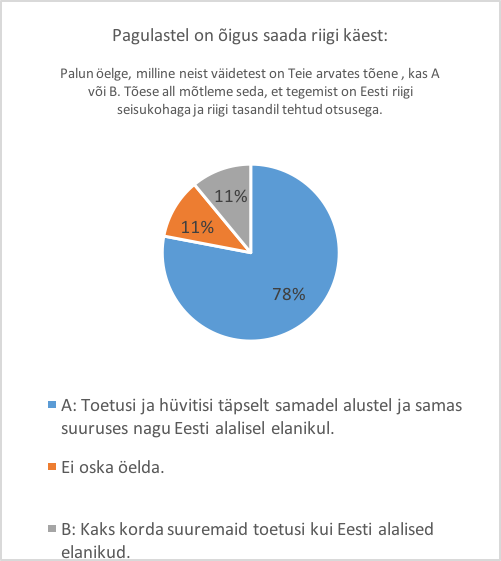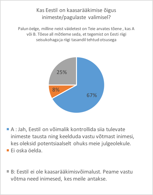 Teadlikkus riigi pagulaspoliitika põhialustest mõjutab samuti hoiakuid selle suhtes, kas rahvusvahelise kaitse andmisel võivad olemasolevale elanikkonnale olla head või halvad mõjud. Kahjuks on seda uurinud vaid TNS EMOR 2015. a juunis. Selgus (vt jooniseid 2 ja 3), et 67% vastanutest teab, et Eesti ametnikud kontrollivad Eestilt kaitse taotlejate tausta enne neile kaitse andmist; koguni veerand vastanutest leidis ekslikult, et Eestil puudub võimalus valida inimesi, keda vastu võetakse. Valdav enamus (78%) teadis ka põhimõtet, mille kohaselt ei erine rahvusvahelise kaitse saajate hüvitised ja toetused Eesti alaliste elanike toetustest. Siiski arvas 11% küsitletutest ekslikult, et tulijatele antakse kaks korda suuremaid toetusi.