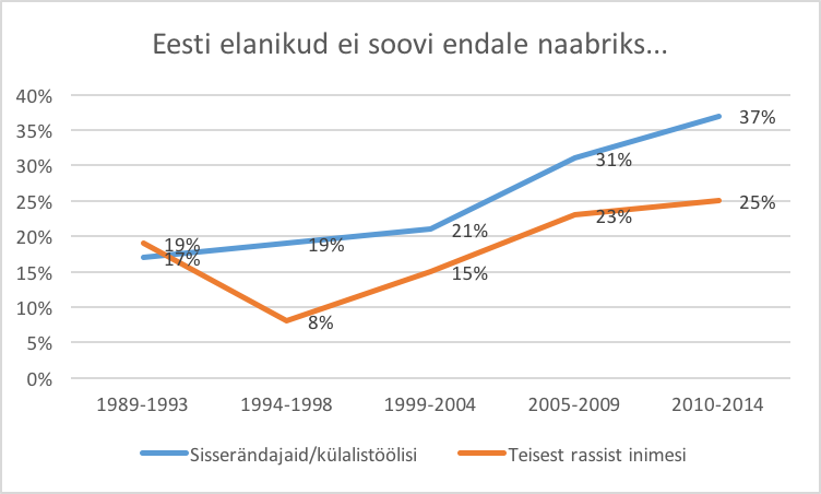 Sallimatus sisserändajate vastu on Eesti taasiseseisvusajal olnud pigem tõusutrendis (vt joonist 4).