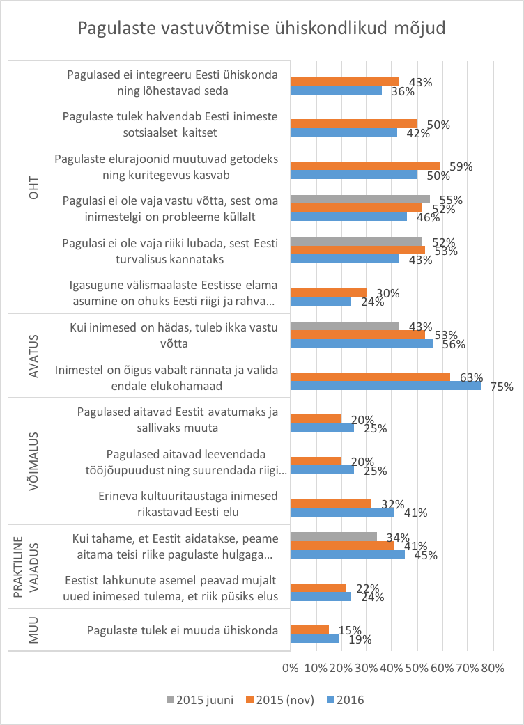 Pagulaste vähene sallimine oma lähikonnas on üldjuhul seotud hinnangutega pagulaste vastuvõtmise ühiskondlike mõjude kohta. Kantar Emori (2016) uuring võimaldab eestimaalaste seas jälgida erinevaid oletatavaid mõjusid ja nende muutumist 2015. a juunist 2016. a oktoobrini.