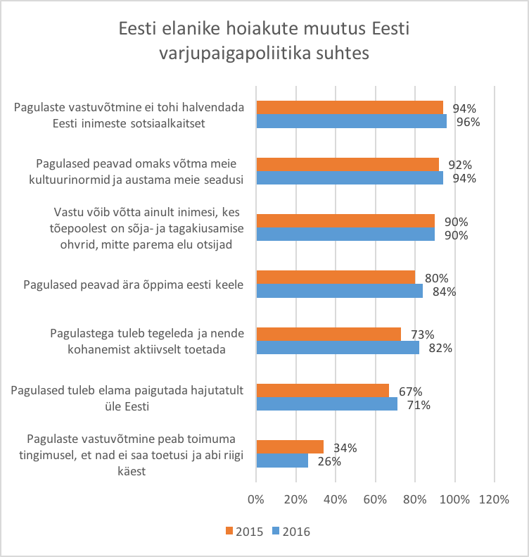 Selgub, et ühe aasta jooksul on elanikkonna hirmud seoses pagulaste Eestisse saabumisega kahanenud. Märgatavalt vähem on näiteks neid, kes kardavad, et pagulased ei integreeru Eesti ühiskonda (langus 7%), et pagulaste tulek kahjustab alaliste elanike sotsiaalset kaitstust (langus 8%), et pagulaste elurajoonid getostuvad (langus 9%). Samal ajal seostab rohkem inimesi pagulaste saabumisega positiivseid arenguid. Eriti oodatakse, et erineva kultuuritaustaga inimesed rikastaksid Eesti elu (tõus 9%). Kiiresti on kasvanud ka eestimaalaste pragmaatiline arusaam, et kui tahame, et Eestit vajadusel aidatakse, peame aitama teisi riike pagulaste ümberpaigutamisega (tõus 9%, võrreldes 2015. aastaga). Ilmselt märkasid eestimaalased pärast 2015. a suve ja sügise esialgset paanikat, et Euroopa Rändekava raames lubatud enam kui 500 inimese Eestisse toomine sujub üsna aeglaselt ja väljaspool kava Eestilt kaitse saajate arv on jätkuvalt väike.